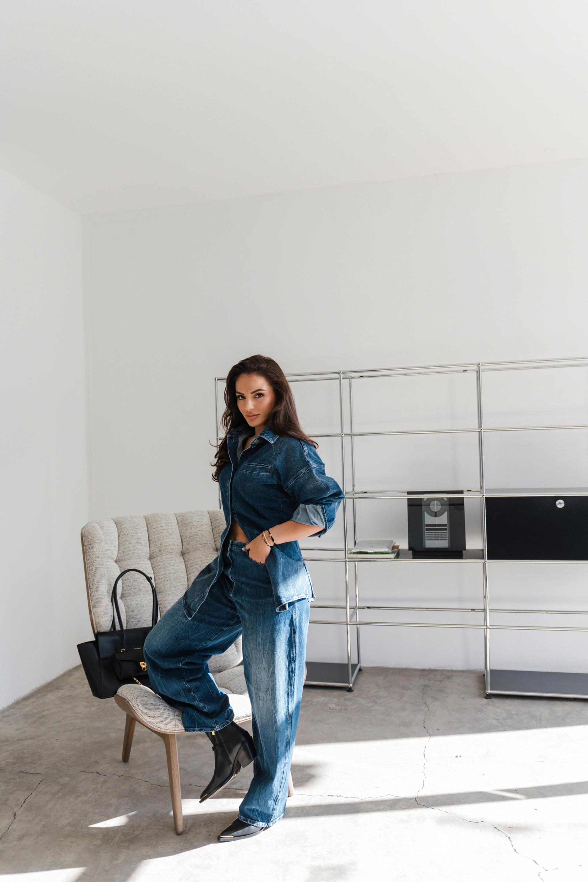 U drugom looku Barbara pokazuje kako spojiti sportsku energiju i urbani stil. Total denim kombinacija – Twinset košulja i traperice – oživljena je uz Coccinelle Double Beat torbicu i kaubojske čizme Coccinelle.